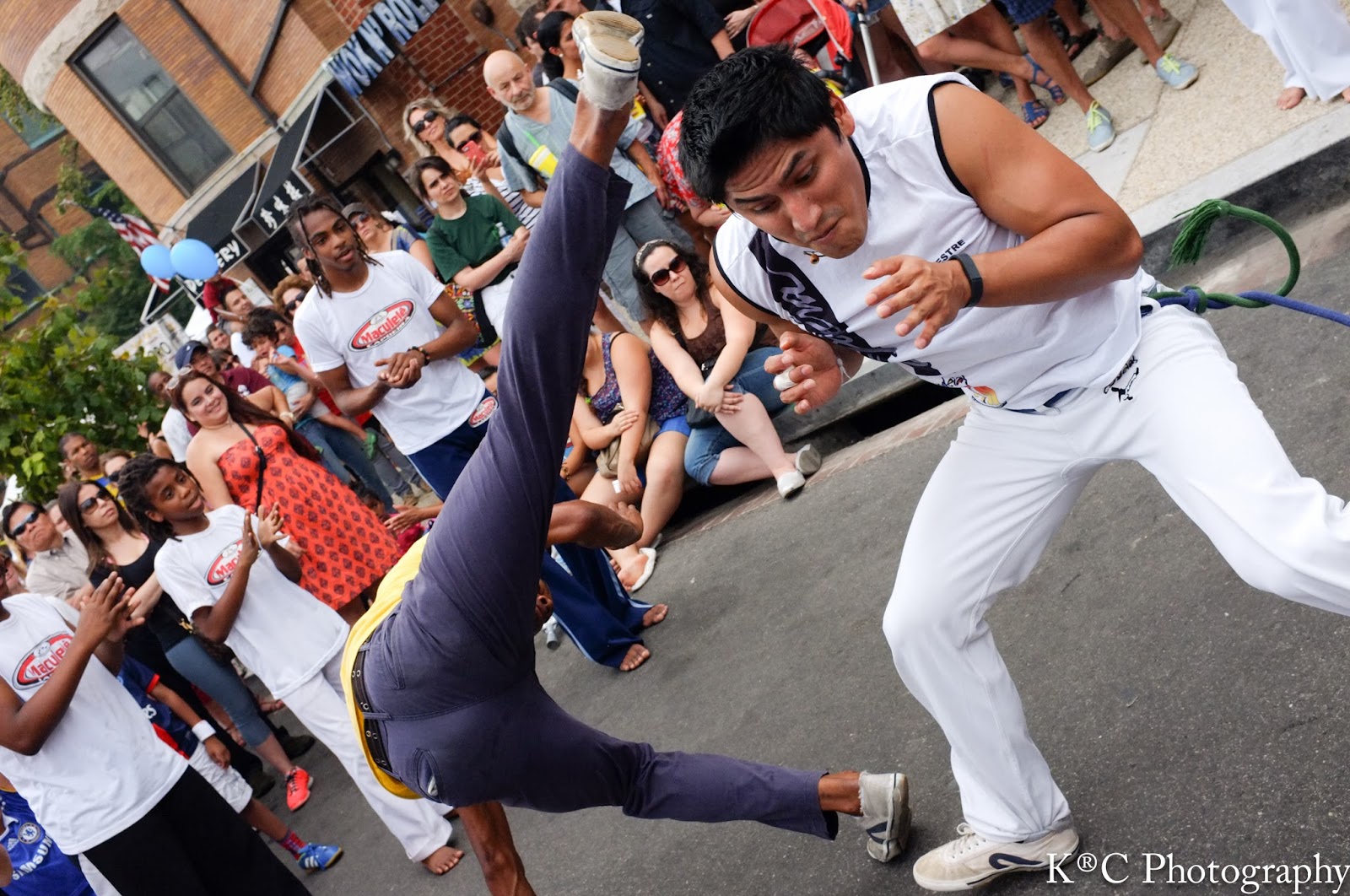 Quoting from Wikipedia, Capoeira is "a Brazilian martial art that combines elements of dance, acrobatics and music, and is sometimes referred to as a game". The DC Capoeira group was preformed during at the Adam's Morgan Street Festival last Sunday. Shooting Capoeira gave me an opportunity to test my x100's ability to capture action. Unlike my D7000, the x100 is known to be weak at shooting action. To get past this weakness, I used the zone focus method to capture many of these shots. When using manual focus, the camera is much more responsive as there is no shutter lag.